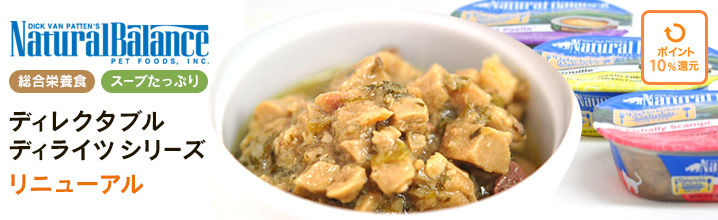タラ・舌平目・エビの魚介系3種類とチキンを組み合わせ、更にタラの肉汁を加えた水分多めのウェットフード
