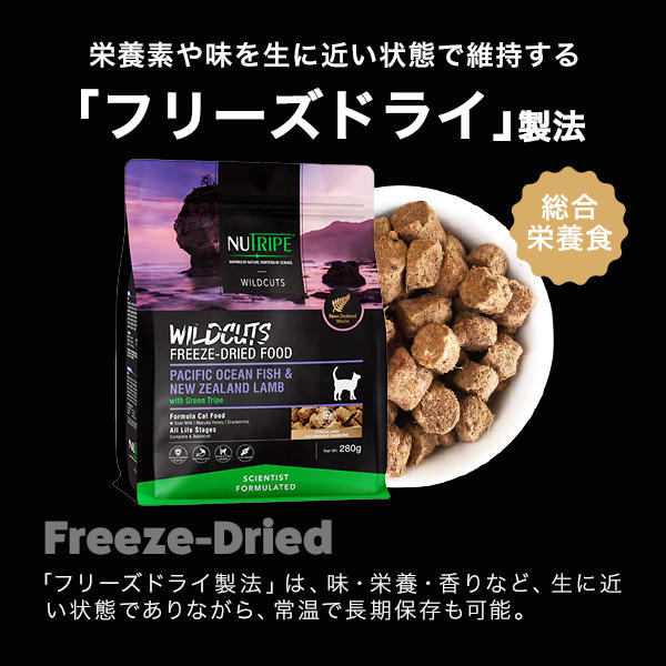 ニュージーランドのブランド『NUTRIPE(ニュートライプ)』から、新フード「ワイルドカット フリーズドライ フィッシュ&ラム withグリーントライプ」が登場となります。「ワイルドカット フリーズドライ」は、マグロやラム、サーモンを使い、フリーズドライ加工で仕上げた総合栄養食。主食としてはもちろん、トッピングやスープの素としても◎