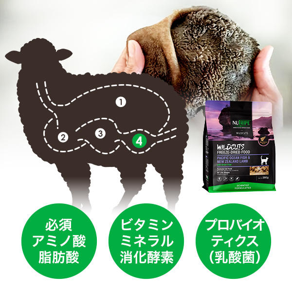 『ニュートライプ』の新フードで使用されている「グリーントライプ」は、十分に消化された胃の内容物を含んだ、第4胃を含む、羊の胃を刻んだもの。
