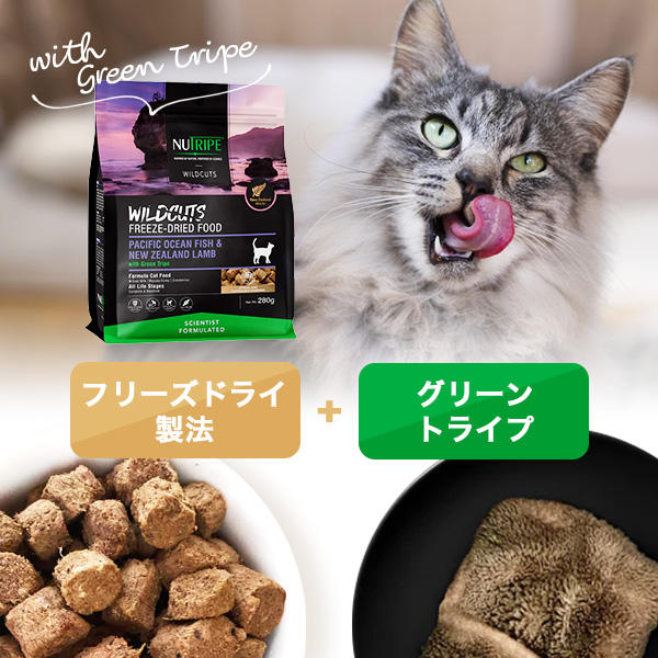 そんな、フリーズドライ加工で仕上げた『ニュートライプ』の新フードは、マグロやサーモンといった猫が好むお魚や、ラムの肉やレバーの他に、隠し味として「グリーントライプ」も使用して、おいしく仕上げています。