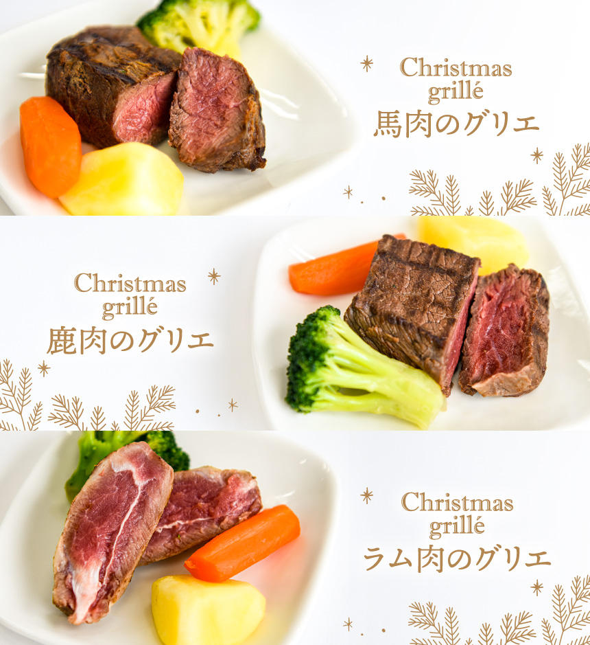 3種のグリエは、赤身肉の馬肉、鹿肉、ラム肉、それぞれのお肉を、そのままおいしくグリル。いずれのグリエにも、クリスマスカラーの赤・緑・白(ニンジン・ブロッコリー・ポテト)の副菜を添えて、一緒にお届けいたします。