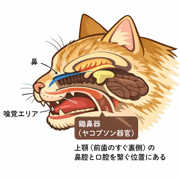 猫のフェロモン理解で外せないのが、鼻の奥にある「鋤鼻器(じょびき・ヤコブソン器官)」です。ここは、一般的な嗅覚とは別ルートで化学物質を受け取り、脳へ情報を送る感覚器官として知られています。つまり猫は、同じ「嗅ぐ」でも、香りを楽しむ回路と、信号を読む回路を使い分けている可能性があるわけです。