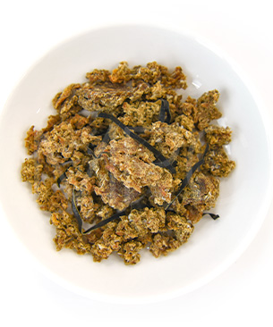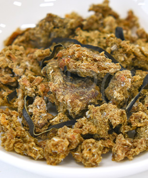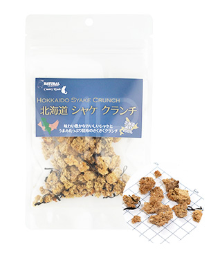 濃厚な味わいのホッケと日高昆布を使用したクランチタイプのオヤツ。ホッケも昆布も北海道産です。そのままオヤツとしても、嗜好性の良さを活かしてフードに振りかけても。
