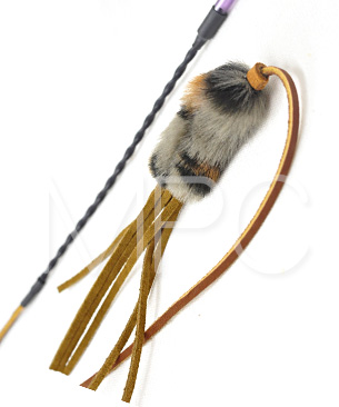 レザーバウンザーは、よくしなる持ち手から紐がゆらゆら揺れ、それだけでも猫の興味をそそるのに革紐の先端にはフェイクファー&ファーからピロッと出たレザーの紐に大興奮です。