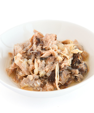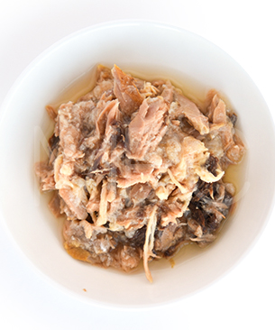ツナブロス、ツナ、チキン、ヒマワリ油、ゲル化剤(海藻、カシアガム、グアーガム、ローカストビーンガム、塩化カリウム、炭酸塩)、ミネラル、酵母エキス、塩化アンモニウム、ビタミンE