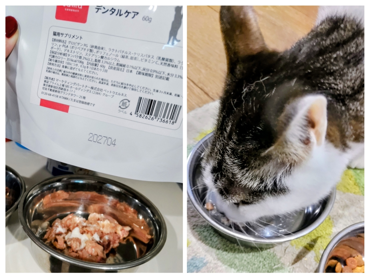我が家に仔猫から成猫まで計11匹の猫が出入りしています。デンタルケアをしてやりたくても外猫なので、警戒心が強い子も多く、歯磨きをしてやることができなかったので、フードにふりかけたりまぜたりしてデンタルケアができるのは本当にうれしいです。フードにふりかけて嫌がった子はなく、いつも完食です!