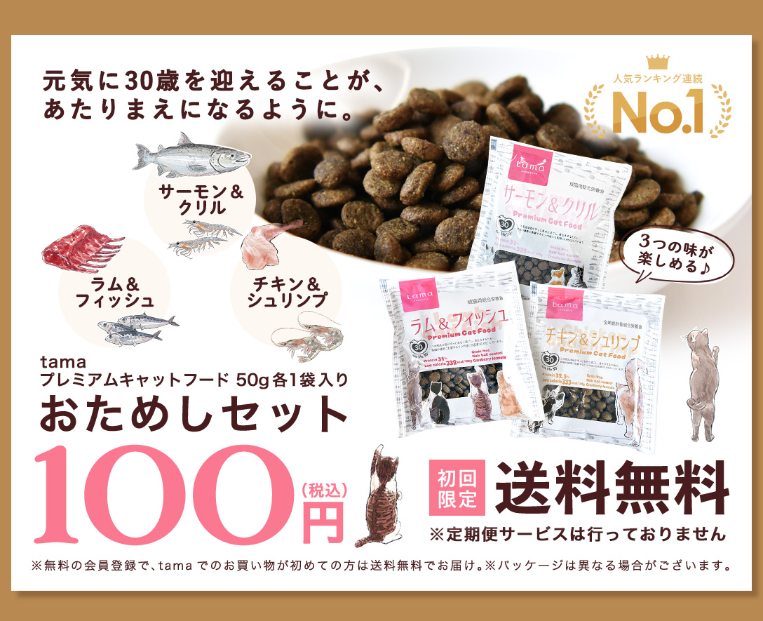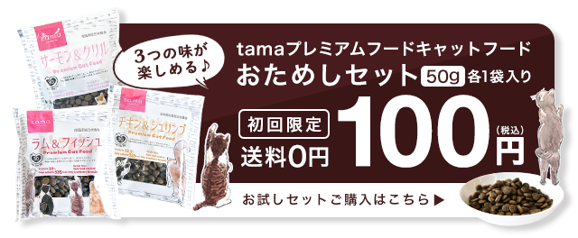 どれが好きかな?3種類の『tama プレミアムキャットフード 各50g』をお試しとして、【初回送料無料】100円でお届け