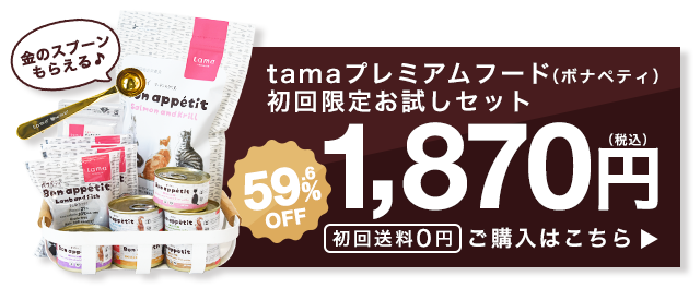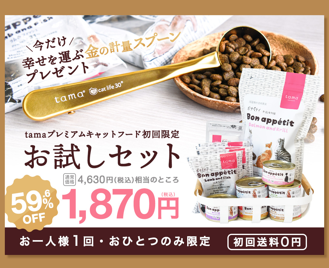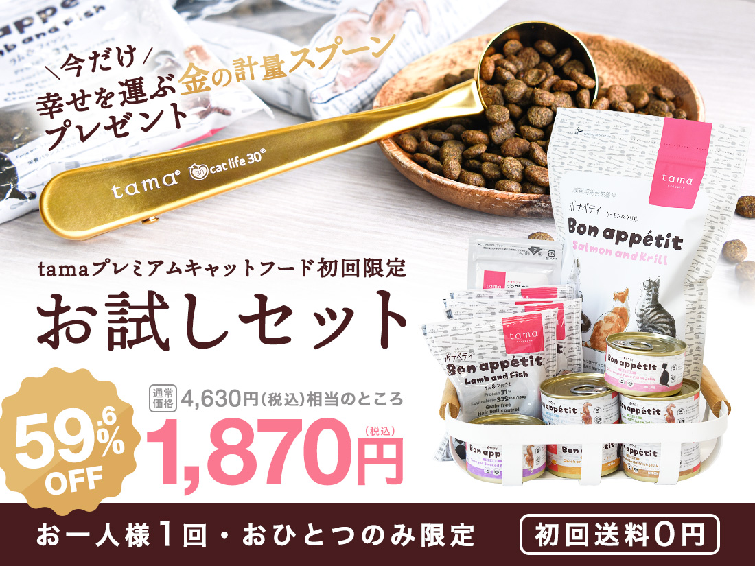 「tama 初回限定お試しセット」では、『tama プレミアム キャットフード(ボナペティ)』のドライフード×3種類、ウェットフード(6缶)4,630円相当をトライアル価格の1,870円(59.6%オフ)でお届けいたします。