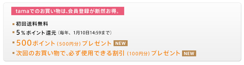 ※無料の会員登録で、tamaでのお買い物が初めての方は送料(佐川急便)【無料】でおとどけします。