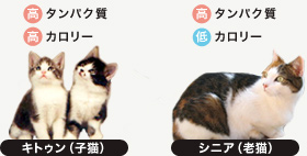 また、シニア猫は内臓機能に衰えが生じるため、消化吸収が良く、高タンパク低カロリーが適します。