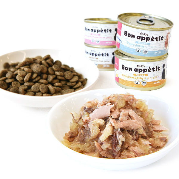 『ボナペティ』ウェットフードは、猫が大好きな《ツナ》や《チキン》をメインの食材とし、ミネラルやビタミンをプラスして、ゼリータイプとしては珍しい、総合栄養食に仕上げています。