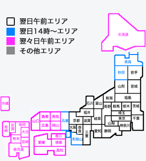 | ピンク | 北海道、島根県(松江市、安来市のみ対象)、広島県(福山市のみ対象)、鳥取県、岡山県、徳島県、香川県、愛媛県、高知県、山口県、福岡県、佐賀県、長崎県、大分県、熊本県、宮崎県、鹿児島県、沖縄県※1 | 翌々日午前~ | |