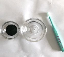 猫用の歯磨きサプリメント「クロロバイトパウダーサプリメント」を使って歯磨きをするべく、テーブルの上にセッティング。 左から、クロロバイトパウダーサプリメント、お水、360°歯ブラシシグワン。