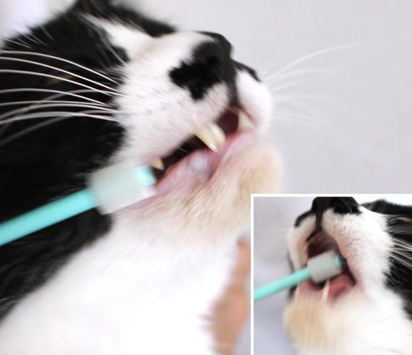 *1 歯磨きに慣れていない猫の場合、初めは歯ブラシやコットンに猫の好きなペースト状のおやつなどを染み込ませ、歯ブラシに慣れさせてください。