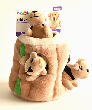 「ハイド&シーク ラージ」は、切り株のぬいぐるみと3匹のリスのぬいぐるみがセットになっているので、切り株の中にリスを隠して遊びましょう。