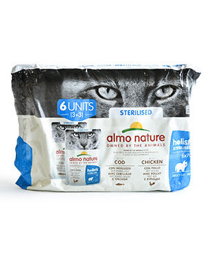 肉や魚を主原材料としながら、避妊去勢後の体重増加のリスクに配慮して、満腹感を得やすい繊維などを含む、ウェットフードの2種類が各3パックセットになっていて通常よりお得です。