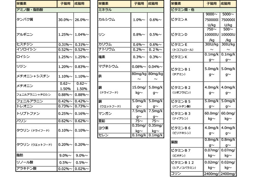 猫の総合栄養食の基準は、各種猫の必須アミノ酸や脂肪酸、ミネラル、ビタミン類などそれぞれの項目で定められています。