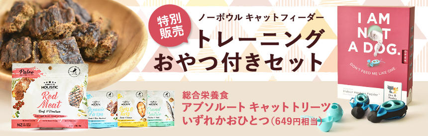 肉食獣である猫の習性を満たす、他にはない全く新しいフードボウル「ノーボウル キャットフィーダー」に、トレーニングにも最適な総合栄養食のオマケが付いた特別セットも現在販売中。