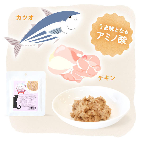 食事に悩む腎臓トラブルを抱えた子のために、おいしいカツオとチキンに加えて、うま味となるアミノ酸を配合しました。