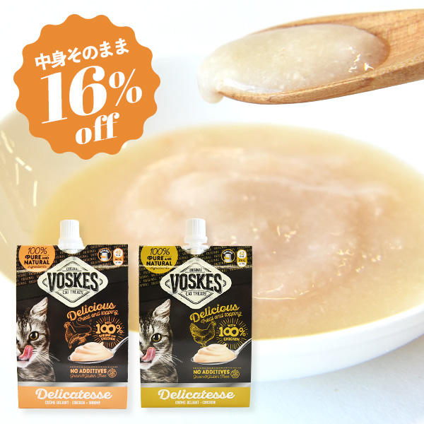 特別価格で販売するのは「ボスケス クレマデリ チキン 90g」と「ボスケス クレマデリ チキン&シュリンプ 90g」。特別価格の理由は、パッケージが旧デザインのため。中身は、通常販売品と同じ内容となります。
