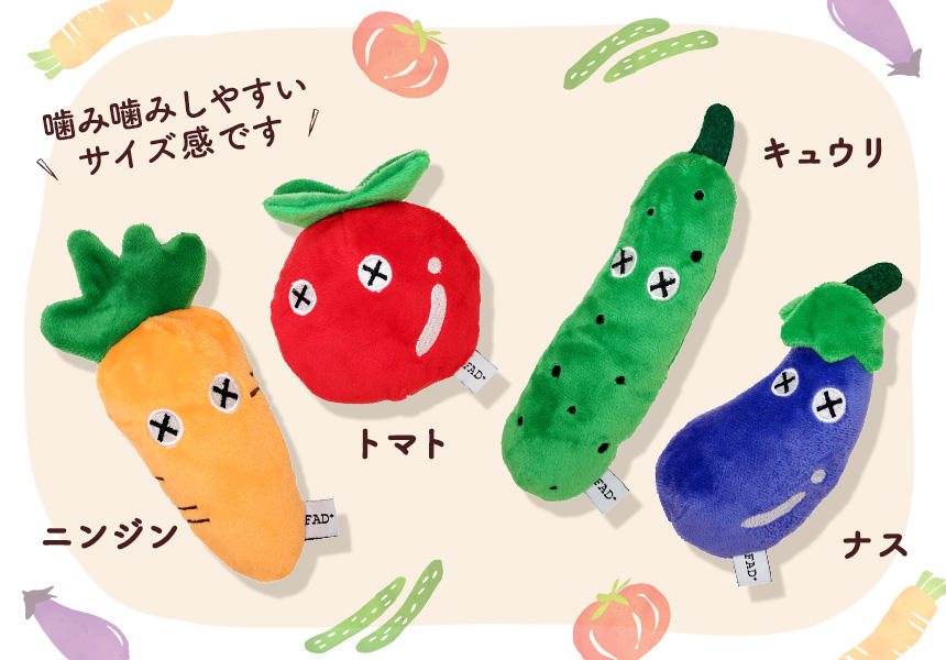 新しく入荷したのは、元気がみなぎるような、カラフルなビタミンカラーを使った、キュウリ・ニンジン・トマト・ナスビの《4種類》の夏野菜モチーフのオモチャ。やさしい肌触りの生地で、噛み噛みしやすいサイズ感。 キューキュー鳴るスクイーカー入りです。