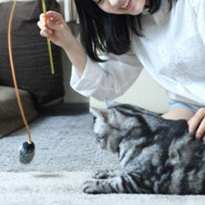 釣り竿や猫じゃらしタイプのおもちゃを使う際、猫の狩りの場面を再現するように物の隙間におもちゃを隠れさせたり、捕まりそうになったら素早く飛び上がるなどの動きを取り入れると、小さな獲物を捕まえることに夢中になってくれます。