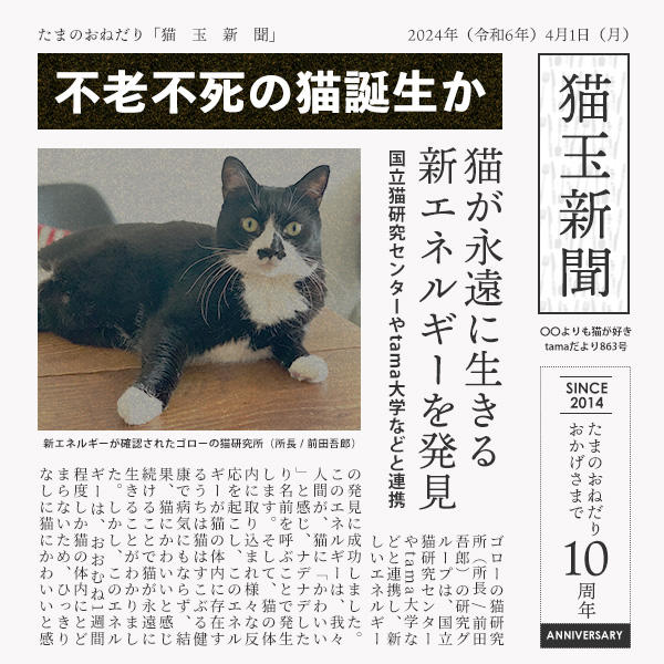 今年のウソは、叶ったらいいなという願いも込めたウソであります。そのウソとは、30歳までといわず、猫が永遠に生きる方法が発見された!という研究報告であります。