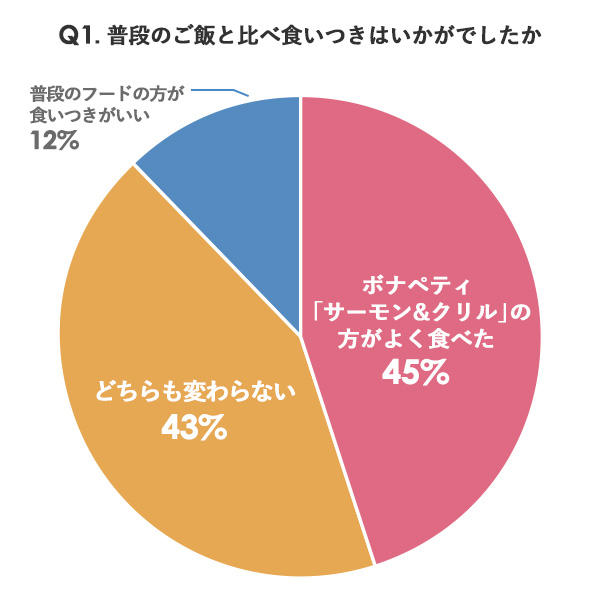 結果は、普段のフードの方が食いつきがいい(12.6%)、という回答を圧倒的に上回り「ボナペティ サーモン&クリル」の方がよく食べた(44.2%)という結果でした。