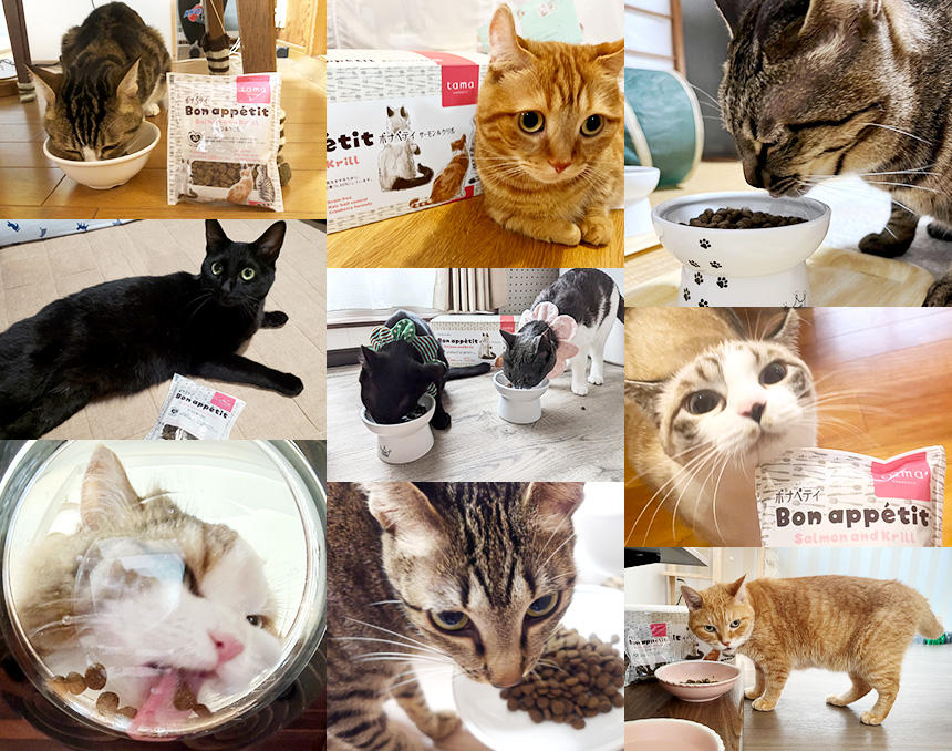 普段からボナペティシリーズのお世話になっていて、元々食いつきは良かったのですが、今回新しい味ということでいつもより更にガツガツと食べていました。他の2つの味もそうですが、サーモン&クリルもとても良い匂いがするので、猫達の食欲をそそるのだと思います。