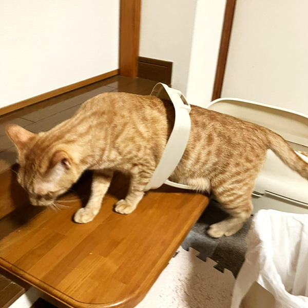 おやつが待ちきれなくてゴミ箱のフタにハマって、それでも早くおやつが欲しくてゴミ箱のフタにハマったまま歩いてた時の写真です。めちゃくちゃ爆笑しました。