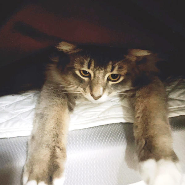 こちらが、ベッドシーツとマットの間に入り込んでいる画像です。なんとも退屈そうな表情(笑)