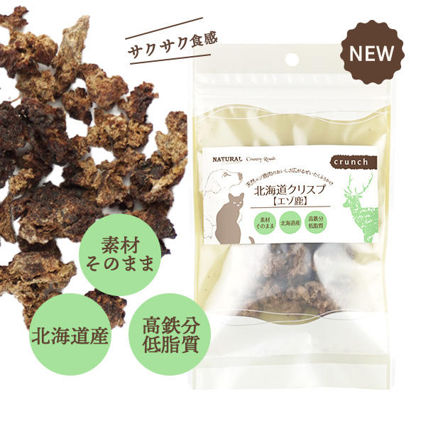 北海道産のエゾ鹿肉をスチーム調理後、じっくりと乾燥して作ったサクサク食感のオヤツ。