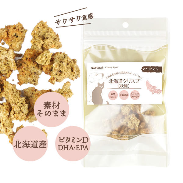北海道産のDHA・EPA・アスタキサンチンが豊富な秋鮭と粉末にした日高昆布をスチーム調理後、じっくりと乾燥して作ったサクサク食感のオヤツ。