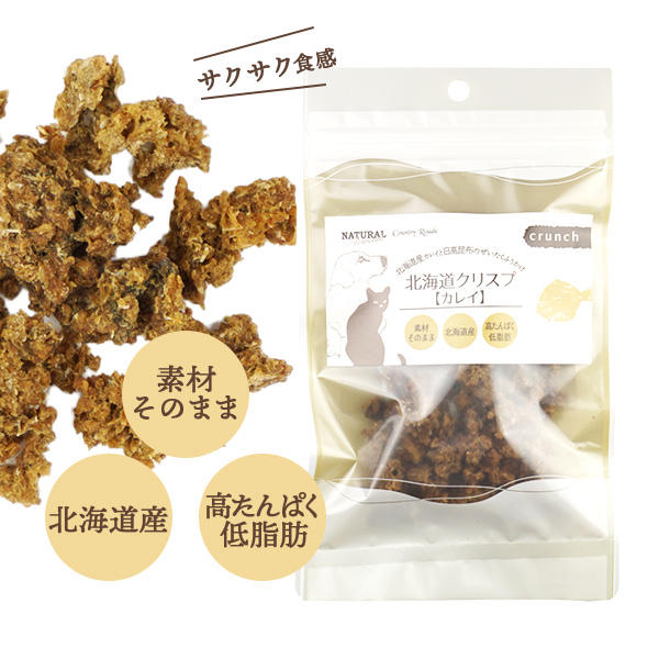 北海道産の高タンパク・低脂質のカレイと、粉末にした昆布を、スチーム調理後じっくりと乾燥して作ったサクサク食感のオヤツ。