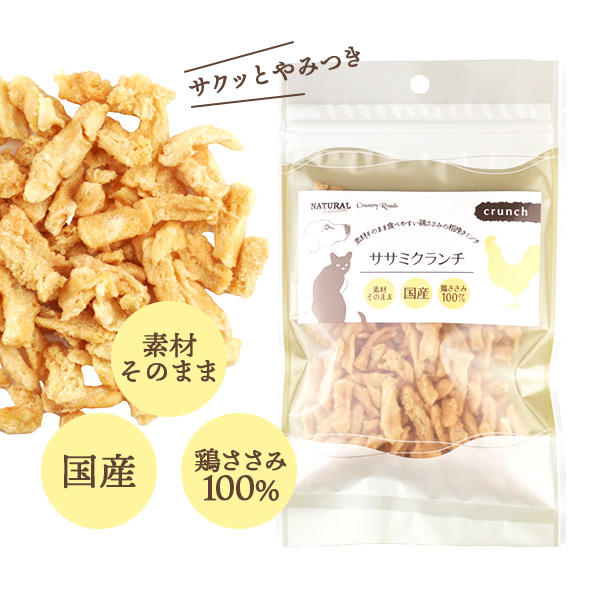 低脂質・高タンパクの鶏肉を粗挽きのミンチにして、低温でじっくり乾燥させたオヤツ。手で簡単に割れる硬さなので、猫の歯でサクッと砕くことができ、食感も楽しめる仕上がり。