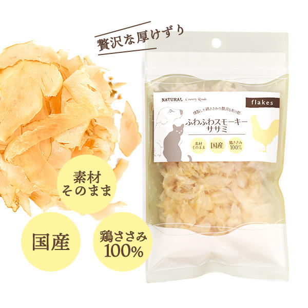 厚めに削ったささみ節を燻した削り節。燻すことで増した香りと旨味が猫の食欲を刺激します。