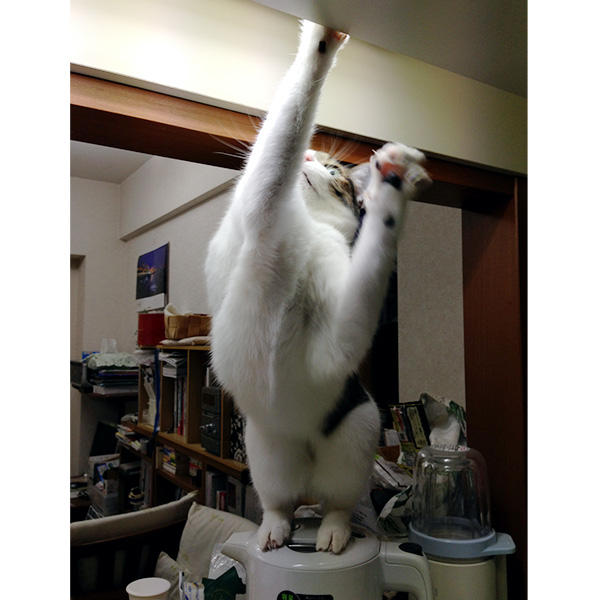 キッチンカウンターに置いてある電気ケトルの上に乗り、ヒモで引っ張るタイプの電気をつけたり消したり...。