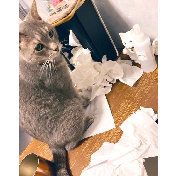 最近になって、ティッシュをめちゃくちゃにするイタズラを覚えてしまいました…ごはんの催促に使える!と気づいたようです。開閉できるティッシュケースですが、年の功か難なく開けて散らかします。