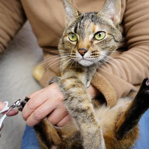 爪を切る際は落ち着ける姿勢を探し、後ろ足から切り始めて最後はおやつやおもちゃを与えて、爪切りのイメージを良くします。