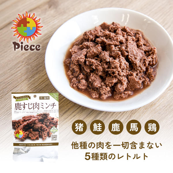 『ピース』から届いたのは、イノシシ・鮭・鹿・馬・鶏、といった草食動物などの肉だけを贅沢に使ったレトルトフード(消化をサポートするローズマリーが微量配合されています。)
