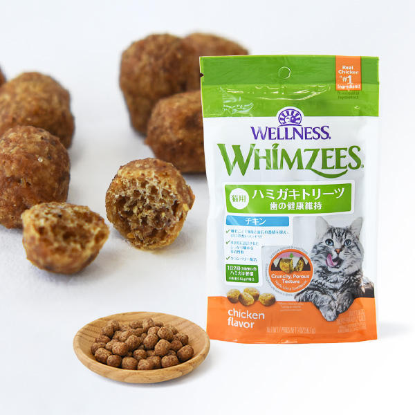 猫用歯磨きオヤツ『ウィムズィーズ』は、噛むことで歯垢や歯石が蓄積しないようサポートするオヤツです。