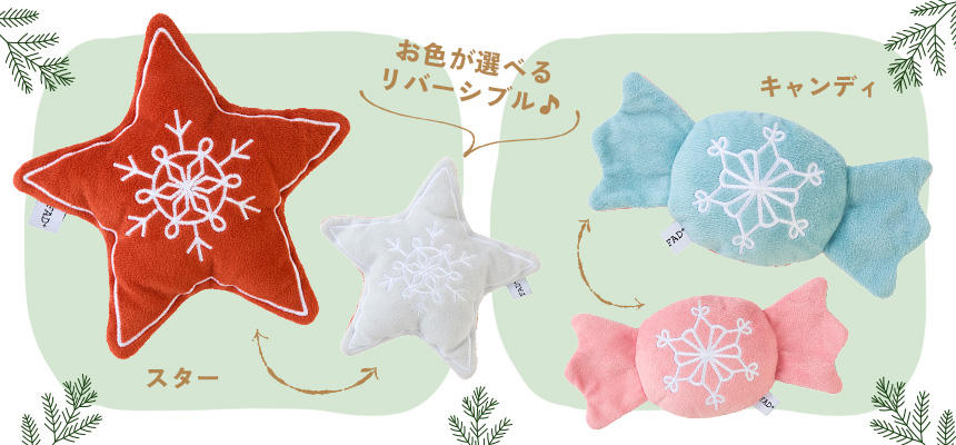 FADからホリデーシーズンデザインのオモチャが新登場。強度に優れた内生地を使用しているため、噛んだり振り回したりしても壊れにくい設計です。