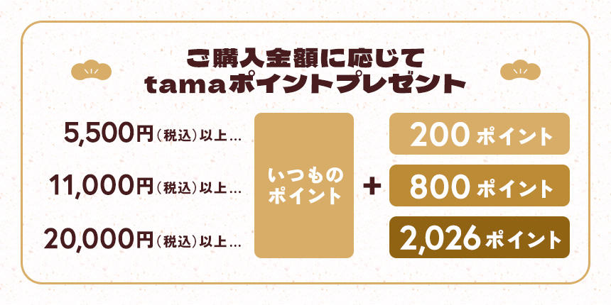 お休み期間中も、お買物をお楽しみいただけるよう、tamaではポイントプレゼントキャンペーンを開催いたします。