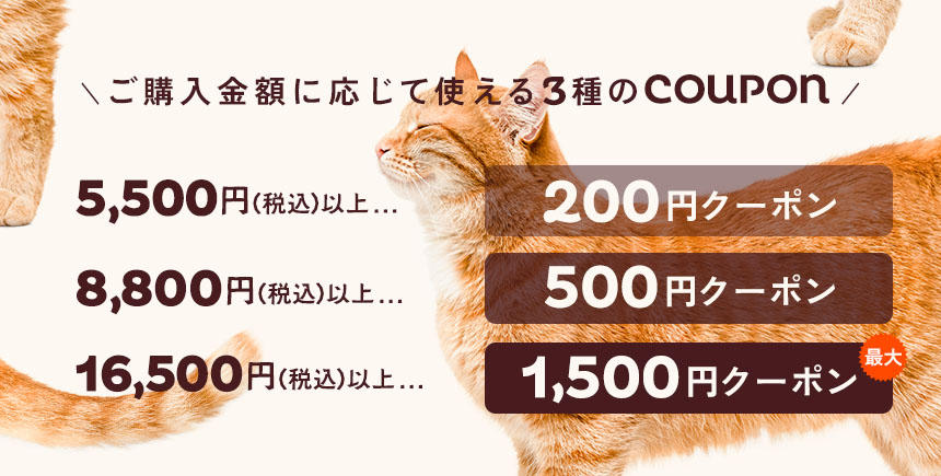 猫の月クーポンとしてご用意したのは、会員様限定でご購入金額に応じてご利用いただける、3種類の特別クーポン。