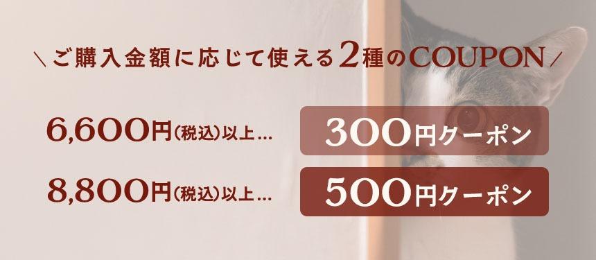 ご購入金額に応じて、合計金額から300円~クーポンがご利用いただけます。