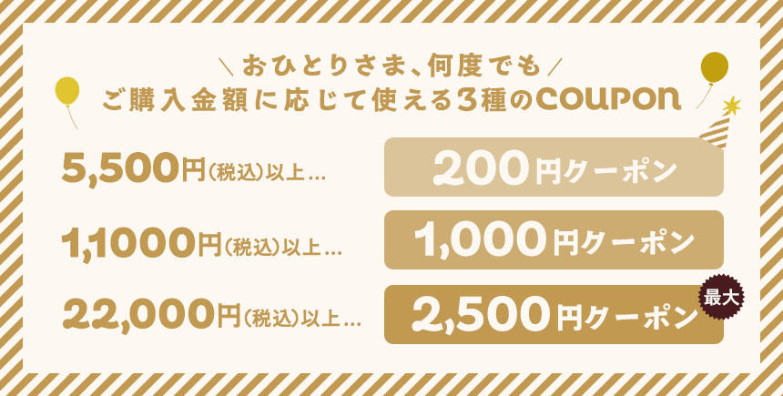 ご購入金額に応じて、合計金額から200円~クーポンがご利用いただけます。