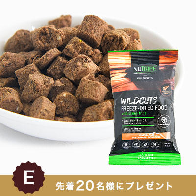 とっても豪華なtamaの創業祭ファイナル、最後にご紹介するプレゼント品は、原材料のおいしさを最大限に生かす加工方法、フリーズドライで仕上げた総合栄養食「ニュートライプ ワイルドカット フリーズドライ フィッシュ&ラム withグリーントライプ 15g(594円相当)」。