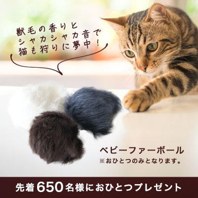そこで、tamaがご用意したプレゼントは、前足で転がして、夢中で追いかけてしまう「ファーボール」。ボールを包む獣毛の香り+転がすたびにボールの中の小石がシャリシャリと音を鳴らすので、猫も狩りに夢中になります。