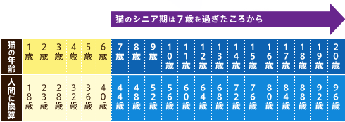 だけど、人間よりも成長の早い猫は、人間の年齢に換算すると40代半ばに当たる7歳くらいから<シニア期>に突入すると考えます。猫の年齢表