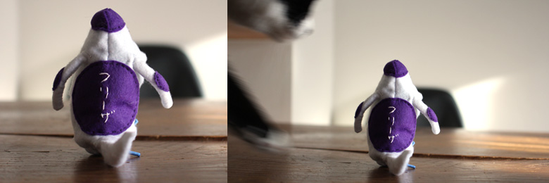 なかなかいい出来に仕上がったフリー○様をテーブルの上に乗せて。なかなか、いいできだな~、なんて悦に浸っていると、悪の気配に気が付き、疾風の速さでフリー○様に先制攻撃を仕掛ける男が!